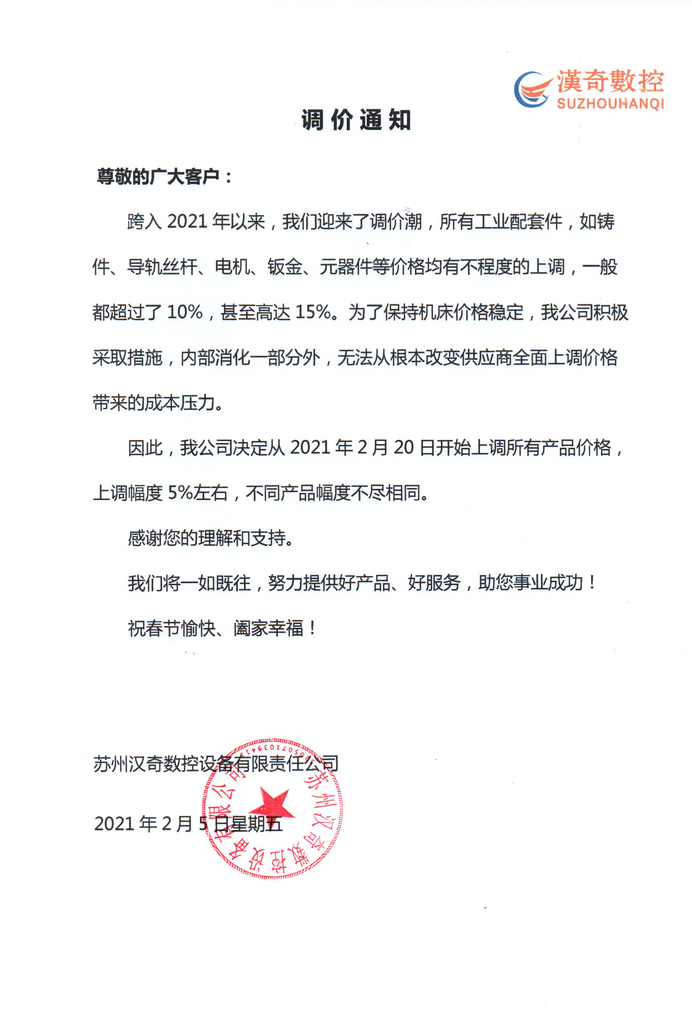 2021蘇州漢奇數(shù)控設(shè)備有限公司產(chǎn)品調(diào)價通知函