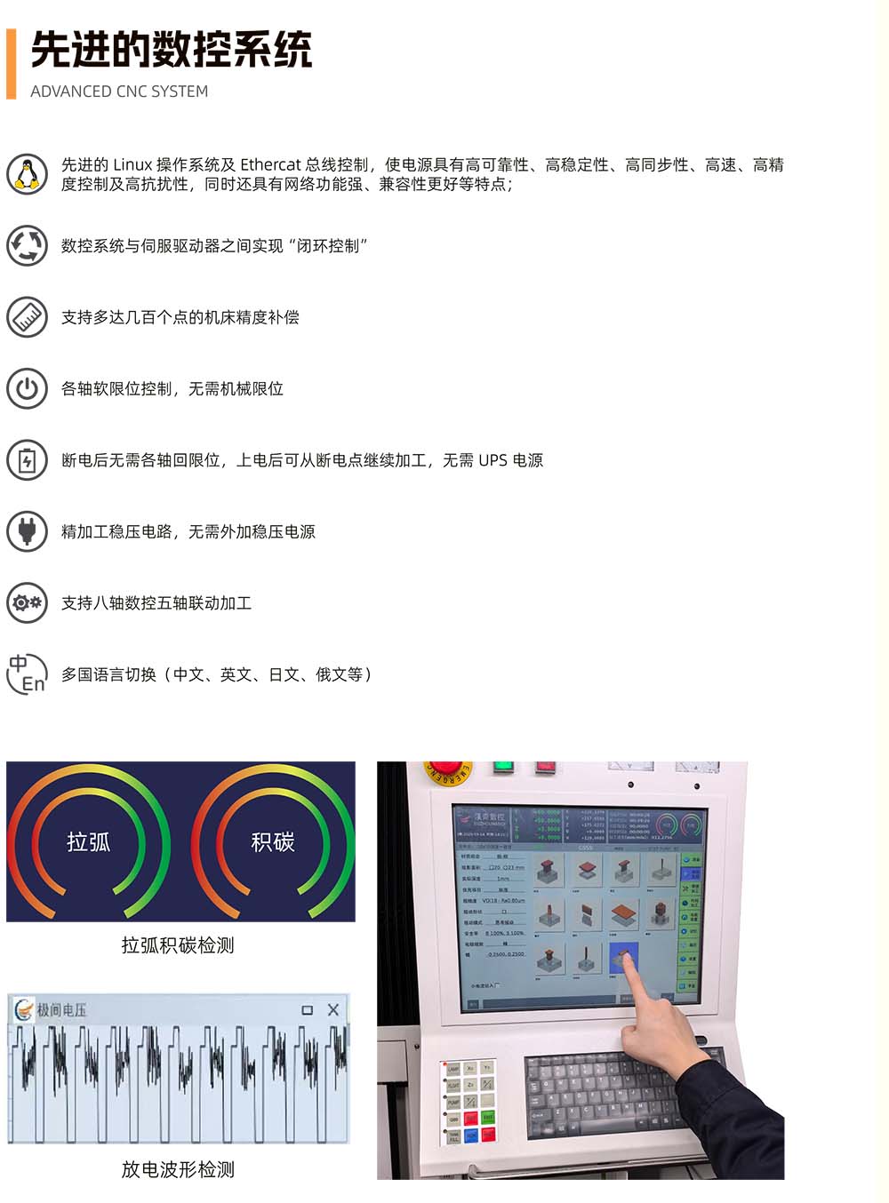 | 搭載總線控制的數(shù)控系統(tǒng)及高速采集放電系統(tǒng),表現(xiàn)出更加優(yōu)秀的加工指標(biāo) | ||