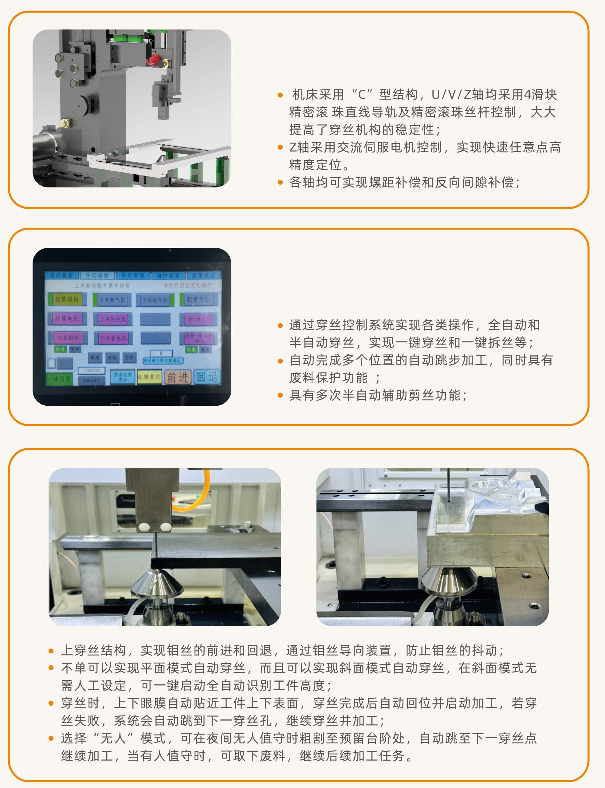 漢奇中走絲系統(tǒng)軟件與中走絲自動穿絲控制系統(tǒng)的完美融合使機(jī)床在自動穿絲可靠性,穩(wěn)定性,耐用性及加工精度保持性等方面得到了有效的保障,機(jī)床具有自動穿絲和半自動穿絲控制模式,穿絲成功率95%以上,大大提高了零件的加工時(shí)間。產(chǎn)品點(diǎn)擊數(shù):